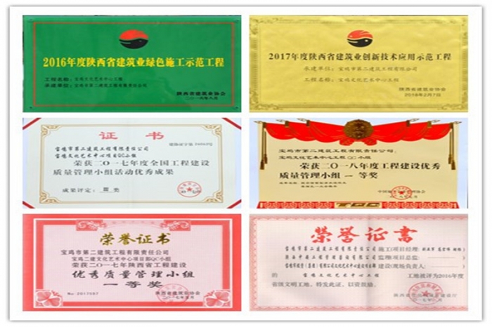 艱難困苦,玉汝于成。通過項目團隊全體員工的共同努力,寶雞文化藝術中心項目先后被評為“2016年度寶雞市優(yōu)質樣板主體工程”“2016年度陜西省建筑業(yè)綠色施工示范工程”“2016年度陜西省省級文明工地”“2017年度陜西省建筑業(yè)創(chuàng)新技術應用示范工程”“2017年度陜西省建筑業(yè)優(yōu)質結構工程”;項目部先后榮獲全國工程建設質量管理小組活動成果獎4項、陜西省工程建設優(yōu)秀QC小組成果獎7項,申報陜西省省級工法1項;項目部先后榮獲公司先進黨支部、先進單位、經濟貢獻特別獎單位、“安康杯”安全文化知識競賽活動二等獎,規(guī)劃局系統(tǒng)先進黨支部等榮譽。