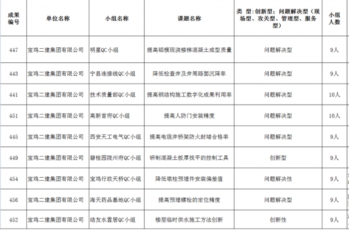 近日,從陜西省建筑業(yè)協(xié)會獲悉,在“2022年陜西省工程建設(shè)質(zhì)量管理小組競賽活動”中,集團(tuán)公司17項成果從2119個成果中脫穎而出,一次性獲得一類成果9項,二類成果4項,三類成果4項。其中技術(shù)質(zhì)量部QC小組的《提高鋼結(jié)構(gòu)施工數(shù)字化成果利用率》和碧水潤園QC小組的《研制一種控制混凝土板厚的裝置》被推薦參加國家QC小組成果發(fā)布。集團(tuán)公司榮獲“2022年陜西省質(zhì)量管理小組活動先進(jìn)企業(yè)”稱號,并連續(xù)八年獲此殊榮。
