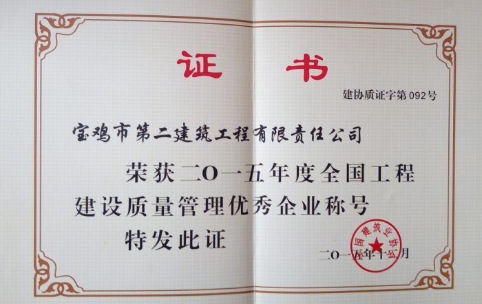 2015年度全國工程建設質(zhì)量管理優(yōu)秀企業(yè)