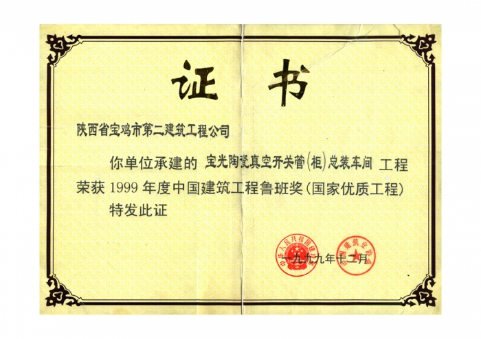 1999年魯班獎(寶光陶瓷真空開關(guān)柜)